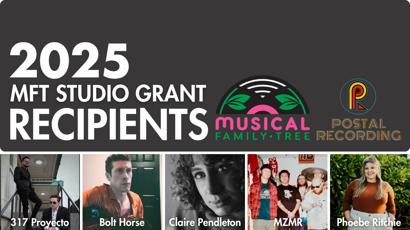 INDIANAPOLIS, IN Monday, October 27, 2025 – Musical Family Tree (MFT), in partnership with Postal Recording, is proud to announce the recipients of the first-ever MFT Studio Grant. Five Indiana-based artists have been selected to receive professional recording services for 1 song recorded over the course of 1 day at Postal Recording’s state-of-the-art studio.